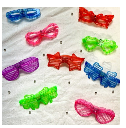 Características principales Modelo Anteojos Luminosos Led Diseño Corazón, Estrella, Redondos, Mariposa Formato de venta Unidad Otras características Material Plástico Con luces Sí Con palabras No Con tecnologia brilla en la oscuridad No